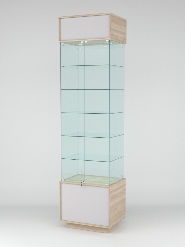 Конструкция включает пять стеклянных полок и подиум из ЛДСП. Корпус оборудован распашными дверцами с замком. В верхнем фризе имеется подсветка.