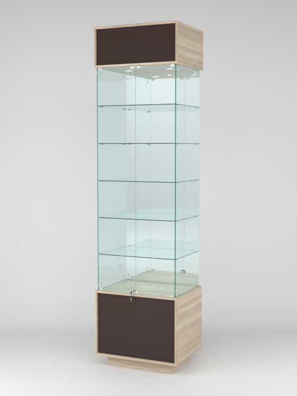 Конструкция включает пять стеклянныхе полок и подиум из ЛДСП. Задняя стенка — зеркало. Корпус оборудован распашной дверцей с замком. В верхнем фризе имеется подсветка.