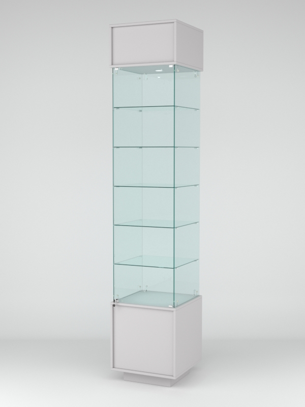 Конструкция включает пять стеклянных полок и подиум из ЛДСП. Корпус оборудован распашной дверцей с замком. В верхнем фризе имеется подсветка.