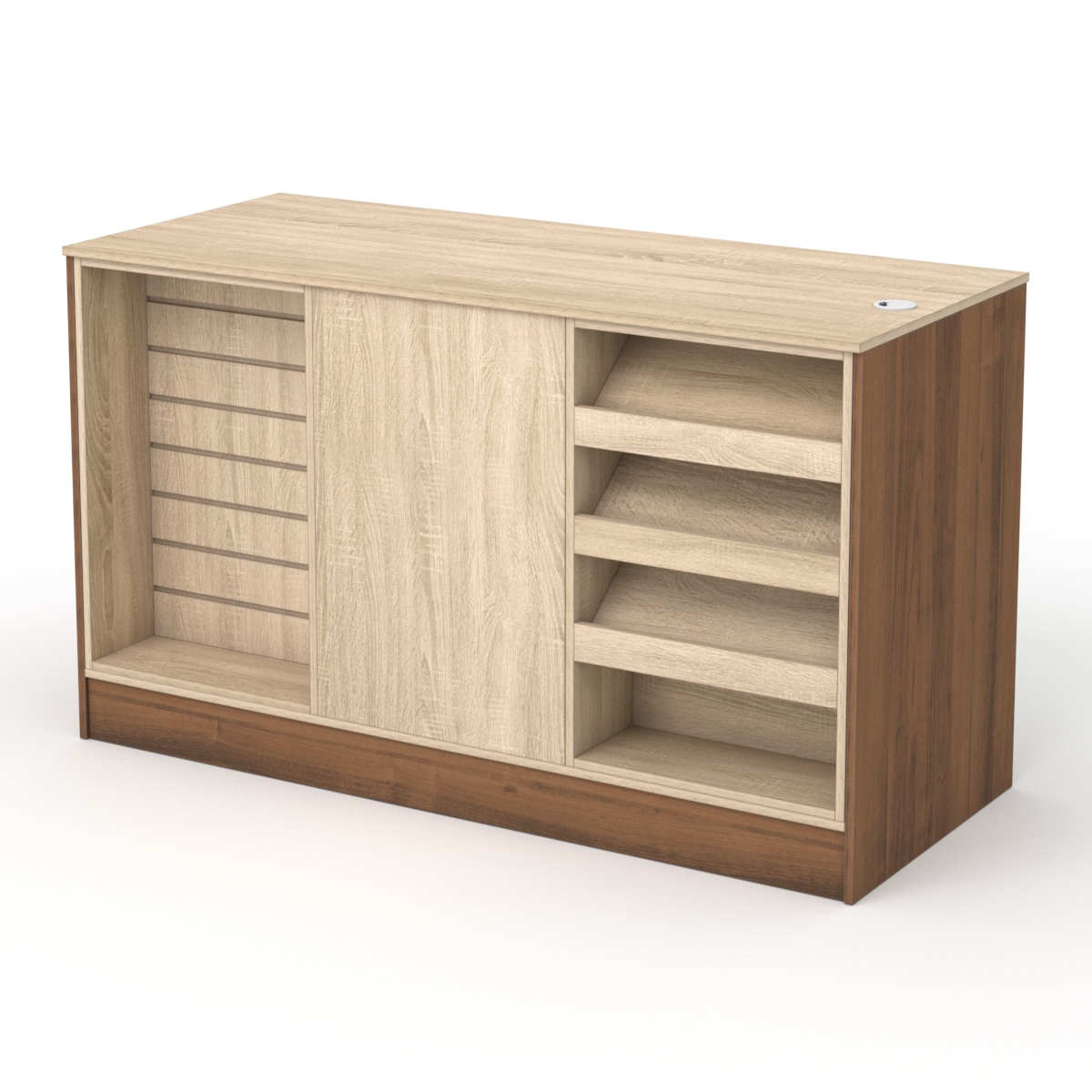 Со стороны кассира изделие оснащено четырьмя полками, где сотрудники могут складывать личные вещи или рабочие предметы.