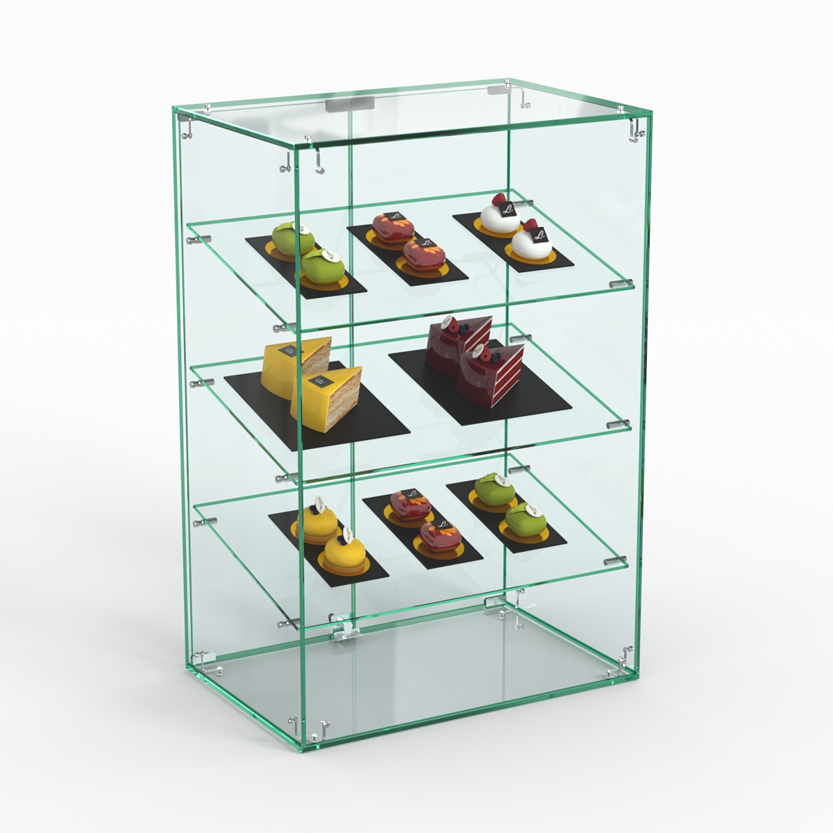 Элегантная закрытая настольная витрина стеклянная для выпечки представляет собой стильный стеллаж с полками. Этажерка на стол идеально демонстрирует разнообразные десерты, сладости и слойки в кафе и кондитерских. Сочетает в себе функциональность и эстетику, обеспечивая максимальную видимость продуктов и товаров.