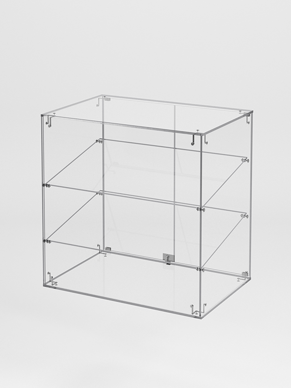 Витрина полностью стеклянная. Внутри располагаются две наклонные полки. Доступ к содержимому обеспечивают распашные дверки, расположенные со стороны продавца.