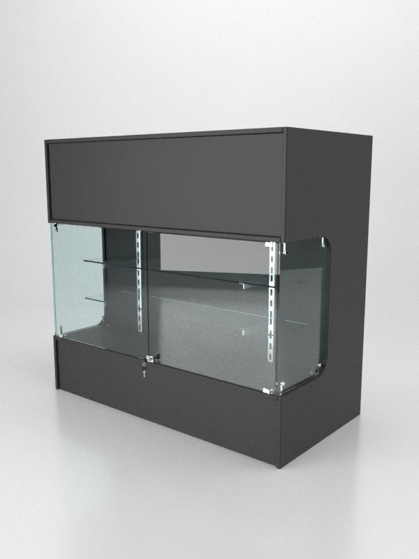 Наша модель ресепшена имеет прямоугольную форму. Каркас выполнен из ЛДСП. С лицевой стороны стойки расположена витрина со стеклянными панелями, двумя полками и раздвижными дверцами. Есть две столешницы — для посетителей и для персонала. С внутренней стороны стойки имеется четыре секции и выдвижной ящик.