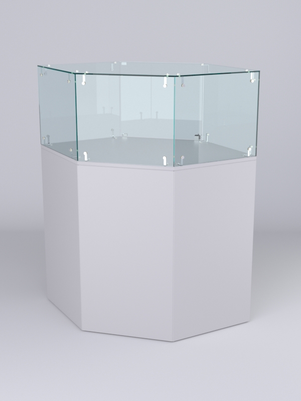 Прилавок имеет шестиугольную форму. Конструкция включает витрину и накопитель. Каждый из элементов оборудован распашной дверцей, открывающейся со стороны продавца. Дверцы снабжены замками. Каркас прилавка выполнен из ЛДСП. Цвет каркаса подбирается в одном из семи вариантов, указанных на сайте.