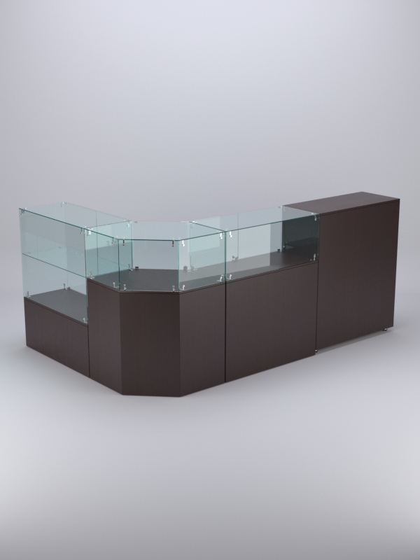 Витрина шестиугольного прилавка также не содержат полок. Шестиугольный прилавок занимает угловую позицию в островке.