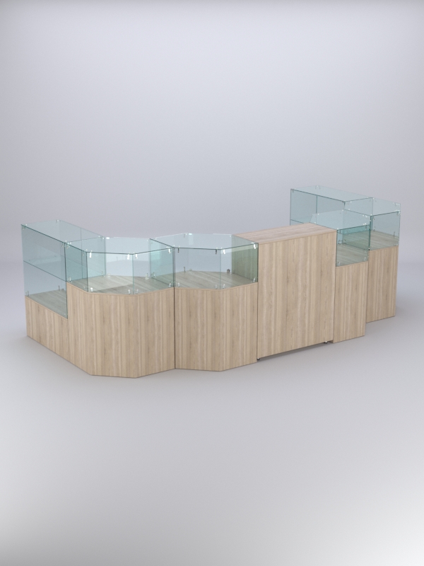 Витрины шестиугольных прилавков не содержат полок. Такие прилавки, в количестве четырех штук, располагаются попарно в углах островка.