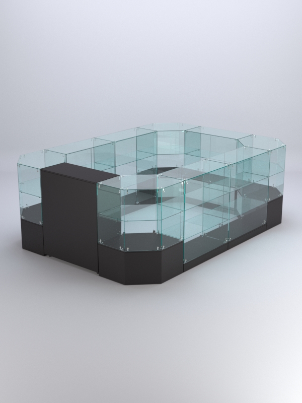Витрины шестиугольных прилавков содержат одну полку. Такие прилавки, в количестве четырех штук, располагаются в углах островка.