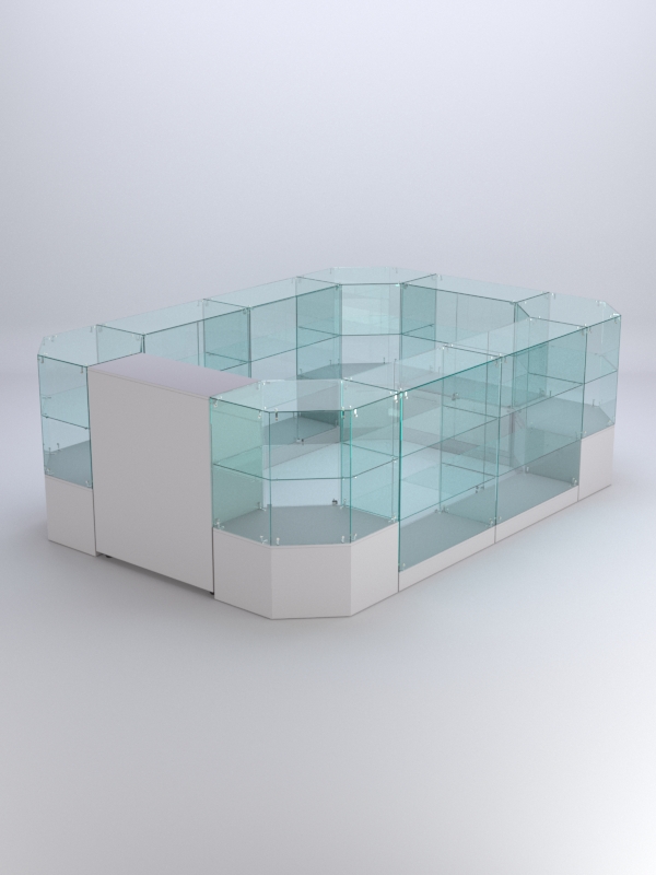 Витрины шестиугольных прилавков содержат одну полку. Такие прилавки, в количестве четырех штук, располагаются в углах островка.
