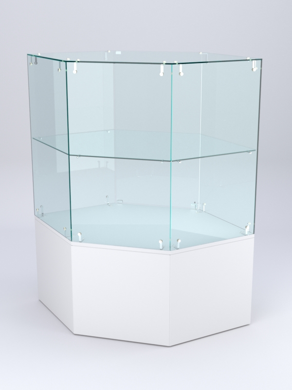 Прилавок имеет шестиугольную форму. Конструкция включает витрину и накопитель. Каждый из элементов оборудован распашной дверцей, открывающейся со стороны продавца. Дверцы снабжены замками. Внутри витрины имеется стеклянная полка. Каркас прилавка выполнен из ЛДСП. Цвет каркаса подбирается в одном из семи вариантов, указанных на сайте.