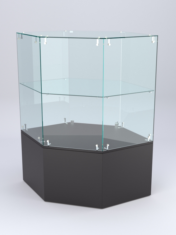 Прилавок имеет шестиугольную форму. Конструкция включает витрину и накопитель. Каждый из элементов оборудован распашной дверцей, открывающейся со стороны продавца. Дверцы снабжены замками. Внутри витрины имеется стеклянная полка. Каркас прилавка выполнен из ЛДСП. Цвет каркаса подбирается в одном из семи вариантов, указанных на сайте.