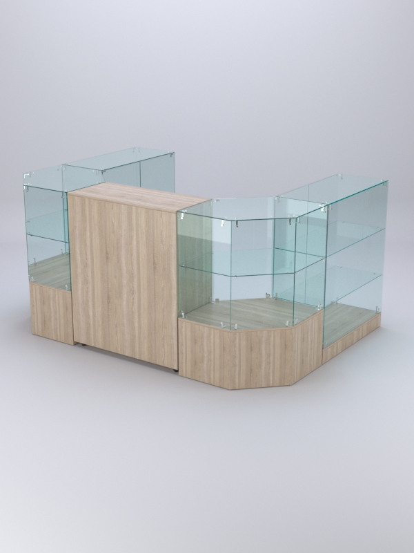 Витрины шестиугольных прилавков содержат одну полку. Два шестиугольных прилавка располагаются по обе стороны от выкатного прилавка, образуя углы с прямыми прилавками.