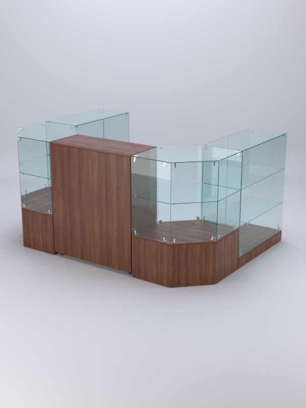 Витрины шестиугольных прилавков содержат одну полку. Два шестиугольных прилавка располагаются по обе стороны от выкатного прилавка, образуя углы с прямыми прилавками.
