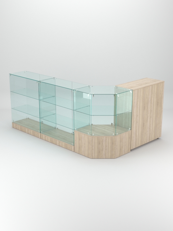 Витрина шестиугольного прилавка содержит одну стеклянную полку. Шестиугольный прилавок располагается между выкатным и прямым прилавком, образуя угол.