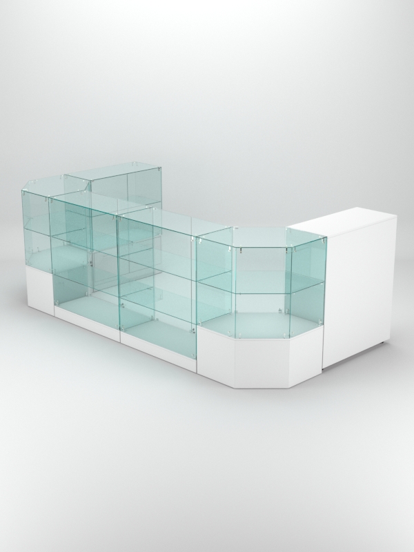 Витрины шестиугольных прилавков содержат одну полку. Оба прилавка располагаются в углах островка.