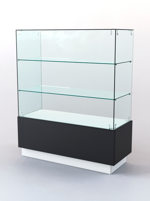 Каркас прилавка выполнен из ЛДСП. Корпус и полка витрины — стеклянные. Нагрузка на полку составляет 5-7кг, с условием равномерного распределения товаров.