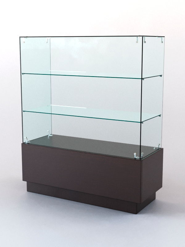 Каркас прилавка выполнен из ЛДСП. Корпус и полка витрины — стеклянные. Нагрузка на полку составляет 5-7кг, с условием равномерного распределения товаров.
