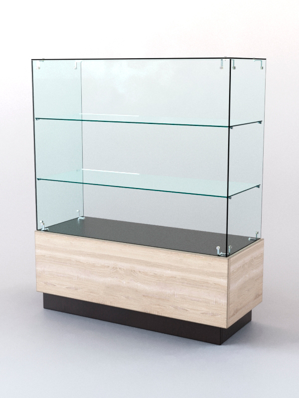 Каркас прилавка выполнен из ЛДСП. Корпус и полка витрины — стеклянные. Нагрузка на полку составляет 5-7кг, с условием равномерного распределения товаров.