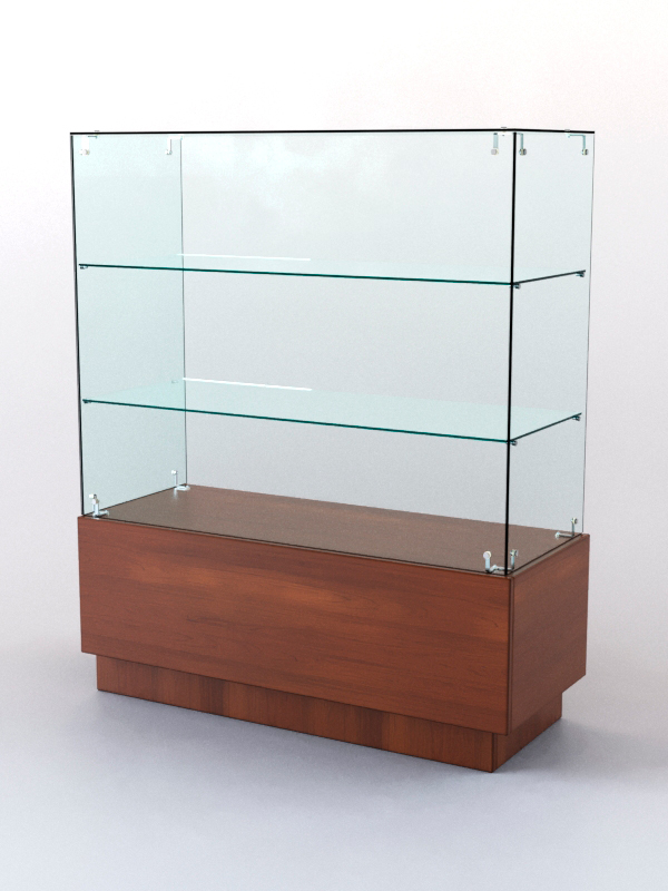 Каркас прилавка выполнен из ЛДСП. Корпус и полка витрины — стеклянные. Нагрузка на полку составляет 5-7кг, с условием равномерного распределения товаров.