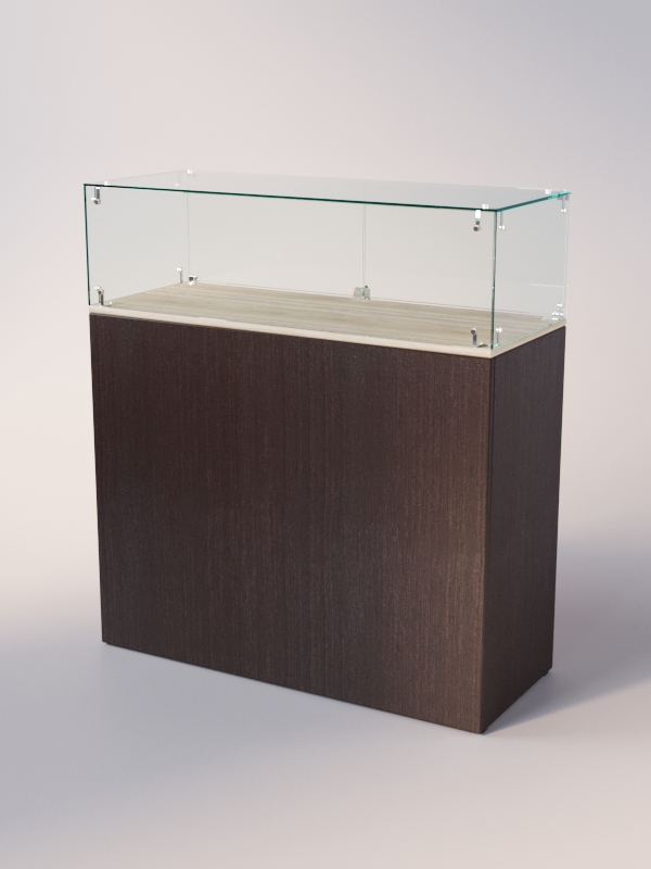 Каркас прилавка выполнен из ЛДСП. Корпус витрины стеклянный. Витрина и накопитель оборудованы распашными дверцами, открывающимися с внутренней стороны.
