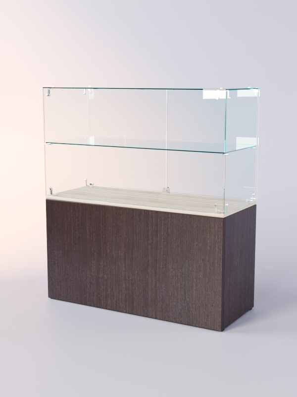 Каркас прилавка выполнен из ЛДСП. Корпус и полка витрины стеклянные. Витрина и накопитель оборудованы распашными дверцами, открывающимися с внутренней стороны.