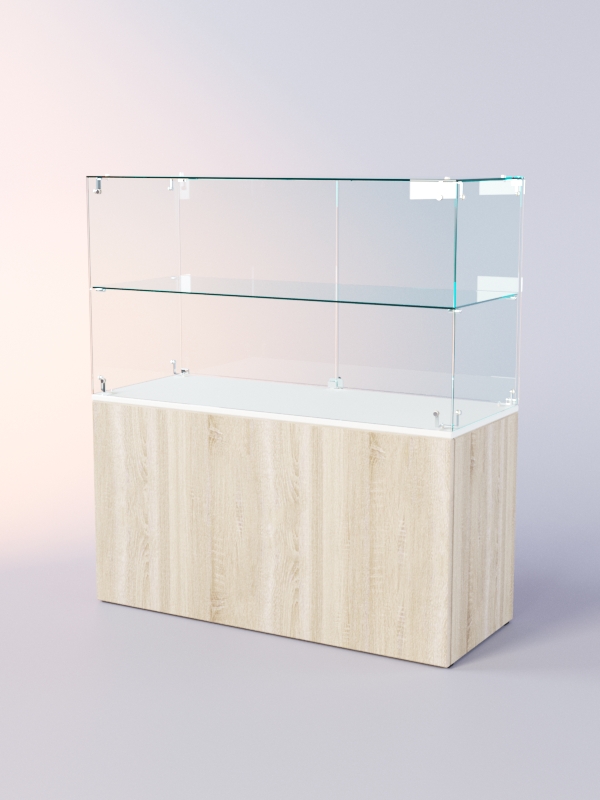 Каркас прилавка выполнен из ЛДСП. Корпус и полка витрины стеклянные. Витрина и накопитель оборудованы распашными дверцами, открывающимися с внутренней стороны.