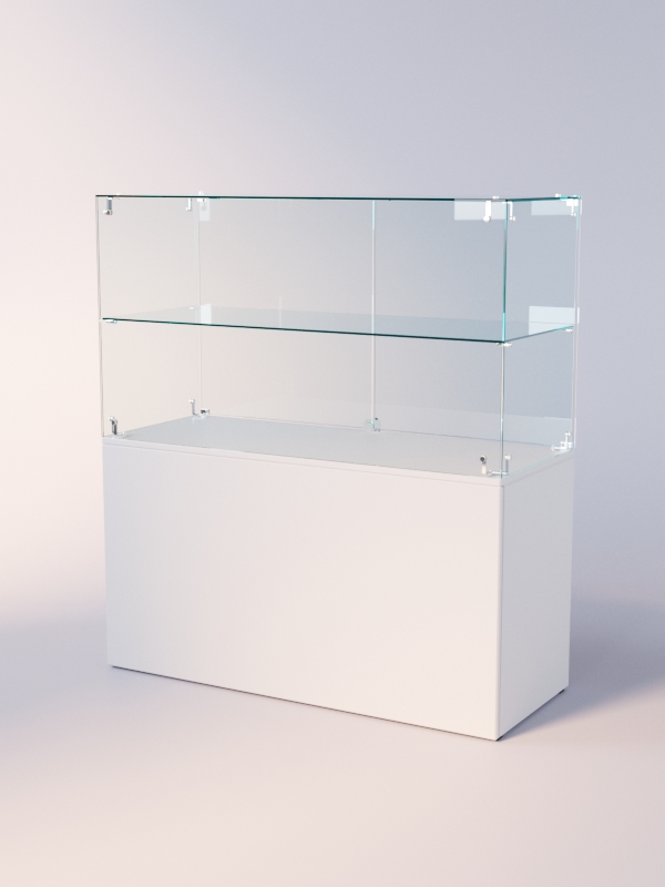Каркас прилавка выполнен из ЛДСП. Корпус и полка витрины стеклянные. Витрина и накопитель оборудованы распашными дверцами, открывающимися с внутренней стороны.