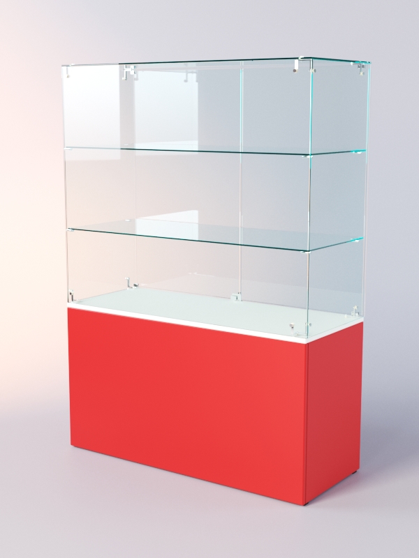 Каркас прилавка выполнен из ЛДСП. Корпус и полки витрины стеклянные. Витрина и накопитель оборудованы распашными дверцами, открывающимися с внутренней стороны.