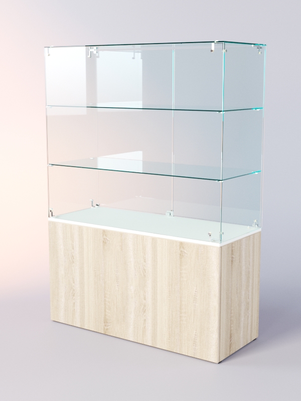 Каркас прилавка выполнен из ЛДСП. Корпус и полки витрины стеклянные. Витрина и накопитель оборудованы распашными дверцами, открывающимися с внутренней стороны.