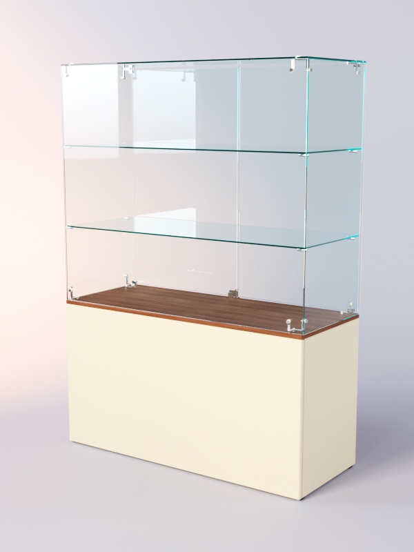 Каркас прилавка выполнен из ЛДСП. Корпус и полки витрины стеклянные. Витрина и накопитель оборудованы распашными дверцами, открывающимися с внутренней стороны.