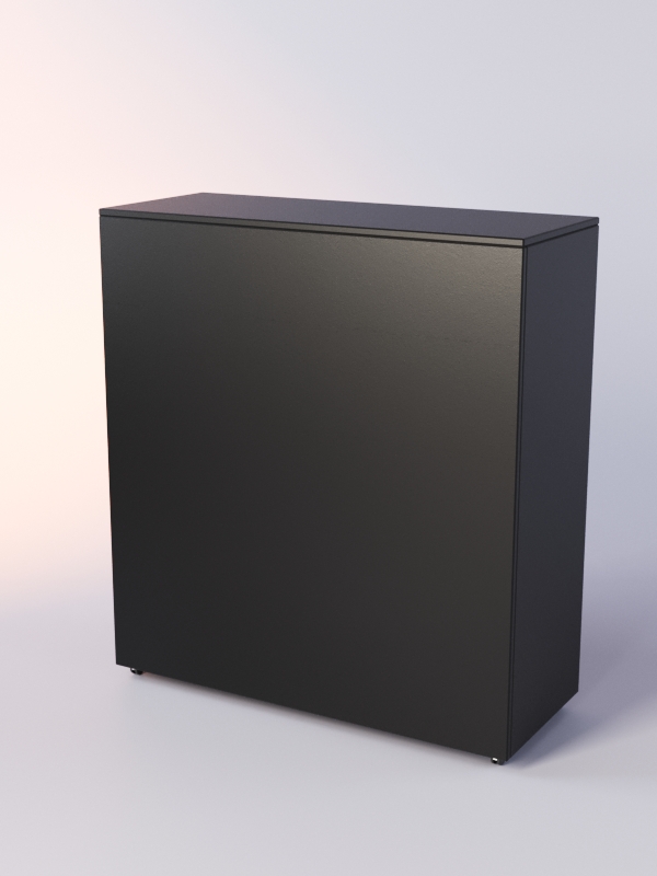 Внешняя сторона прилавка полностью закрыта со стороны покупателя. С внутренней стороны имеется большое отделение и накопитель с распашными дверцами.