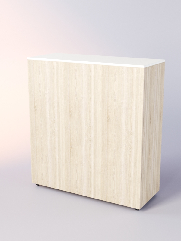 Внешняя сторона прилавка полностью закрыта со стороны покупателя. С внутренней стороны имеется большое отделение и накопитель с распашными дверцами.