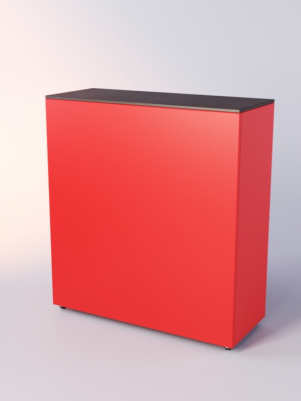 Внешняя сторона прилавка полностью закрыта со стороны покупателя. С внутренней стороны имеется большое отделение и накопитель с распашными дверцами.