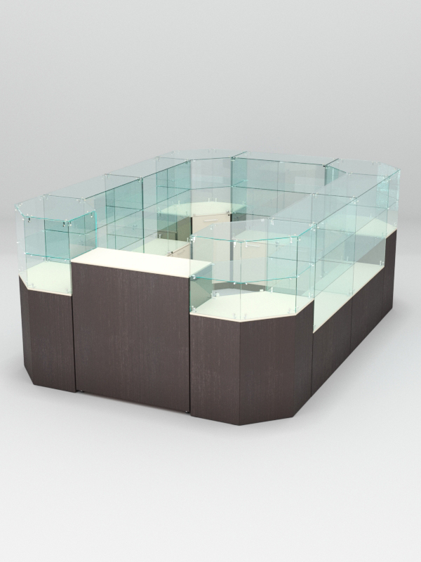 Каркас прилавков выполнен из ЛДСП. Корпус и полки витрин изготовлены из стекла. Витрины содержат 1-2 полки. Нагрузка на одну полку составляет 5-7кг, с условием равномерного распределения товаров.