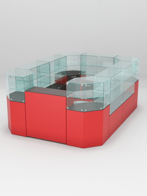 Данная модель представляет собой закрытую систему из нескольких прилавков. Сюда входят прилавки с витриной, содержащие разное количество полок, а также закрытый выкатной прилавок.
