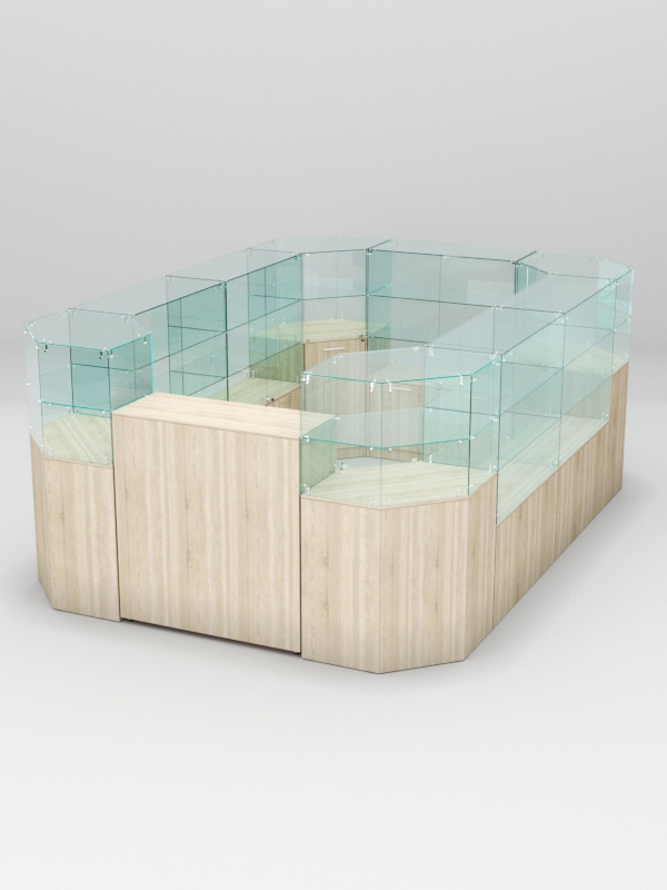 Каркас прилавков выполнен из ЛДСП. Корпус и полки витрин изготовлены из стекла. Витрины содержат 1-2 полки. Нагрузка на одну полку составляет 5-7кг, с условием равномерного распределения товаров.