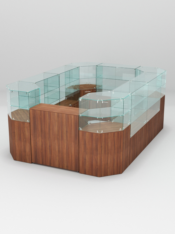 Данная модель представляет собой закрытую систему из нескольких прилавков. Сюда входят прилавки с витриной, содержащие разное количество полок, а также закрытый выкатной прилавок.