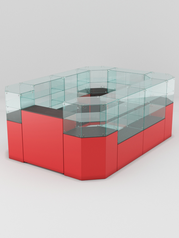 Данная модель представляет собой закрытую систему из нескольких прилавков. Сюда входят прилавки с витриной, содержащие разное количество полок, а также закрытый выкатной прилавок.
