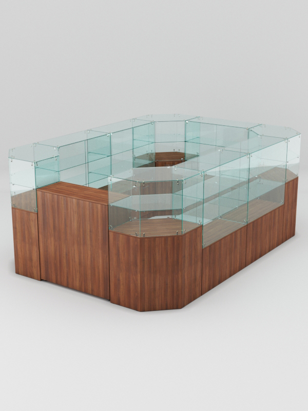 Данная модель представляет собой закрытую систему из нескольких прилавков. Сюда входят прилавки с витриной, содержащие разное количество полок, а также закрытый выкатной прилавок.