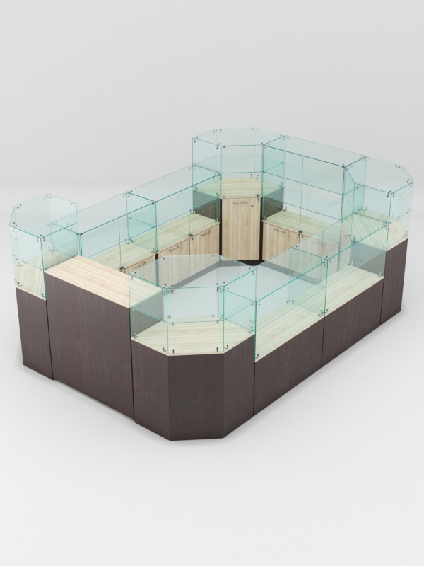 Каркас прилавков выполнен из ЛДСП. Корпус и полки витрин изготовлены из стекла. Витрины содержат 1-2 полки. Нагрузка на одну полку составляет 5-7кг, с условием равномерного распределения товаров.