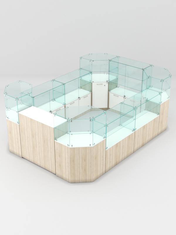 Каркас прилавков выполнен из ЛДСП. Корпус и полки витрин изготовлены из стекла. Витрины содержат 1-2 полки. Нагрузка на одну полку составляет 5-7кг, с условием равномерного распределения товаров.