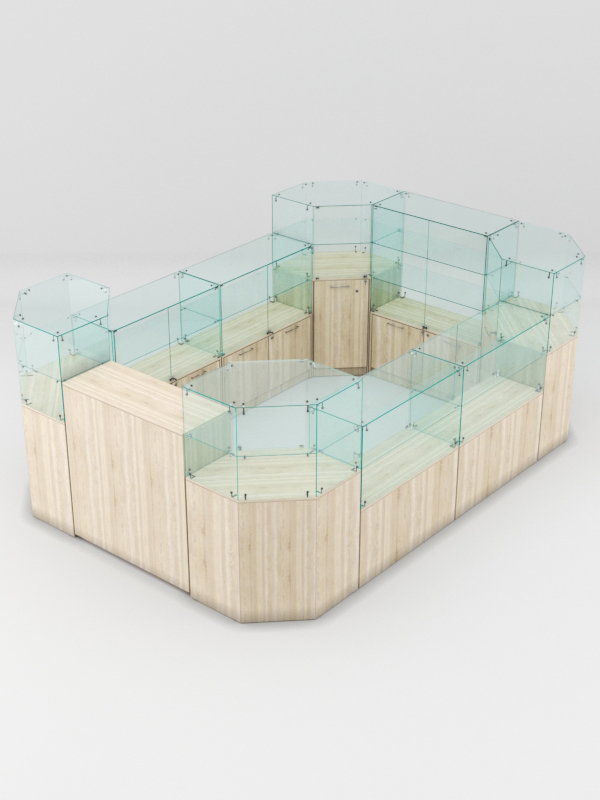 Данная модель представляет собой закрытую систему из нескольких прилавков. Сюда входят прилавки с витриной, содержащие разное количество полок, а также закрытый выкатной прилавок.