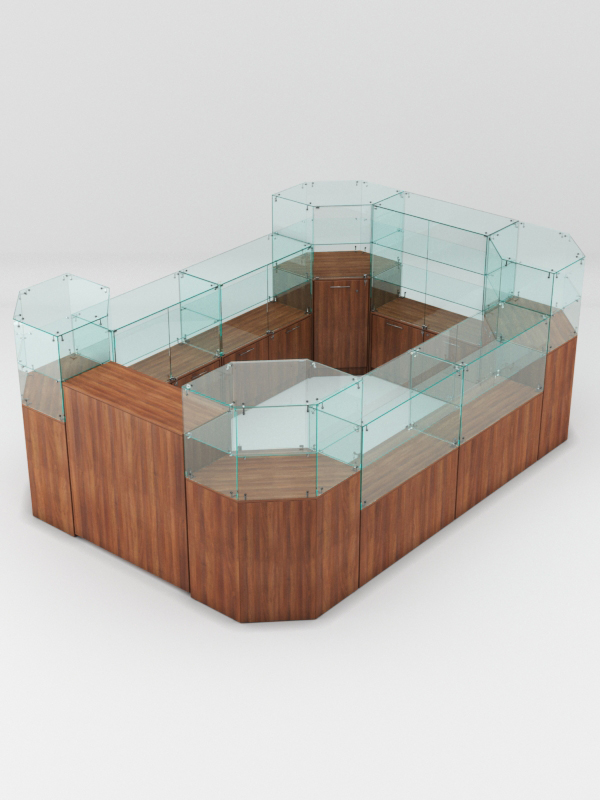Данная модель представляет собой закрытую систему из нескольких прилавков. Сюда входят прилавки с витриной, содержащие разное количество полок, а также закрытый выкатной прилавок.