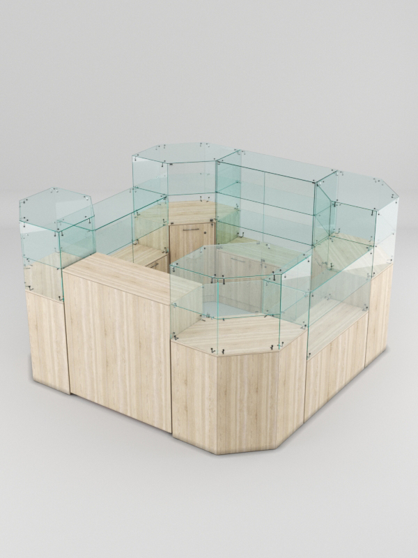 Каркас прилавков выполнен из ЛДСП. Корпус и полки витрин изготовлены из стекла. Витрины содержат 1-2 полки. Нагрузка на одну полку составляет 5-7кг, с условием равномерного распределения товаров.