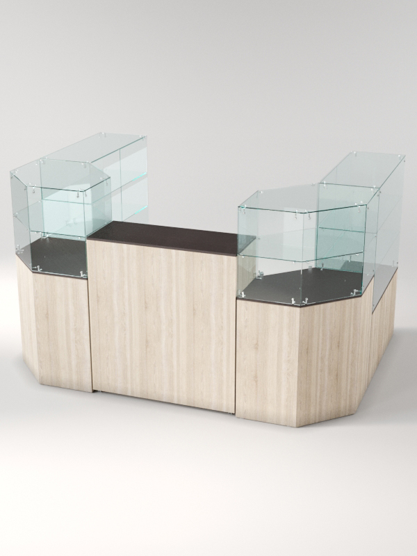 Данная модель представляет собой симметричную открытую систему из нескольких прилавков. Сюда входят прямоугольные прилавки с витриной, содержащие две полки, шестиугольные прилавки с одной полкой, а также закрытый выкатной прилавок.