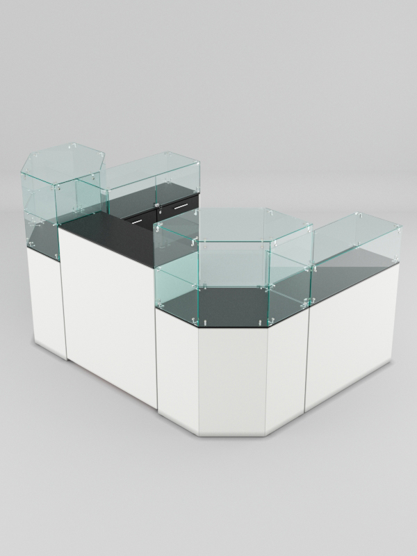 Данная модель представляет собой открытую симметричную систему из нескольких прилавков. Сюда входят прямоугольные прилавки с витриной, шестиугольные прилавки с одной полкой, а также закрытый выкатной прилавок.