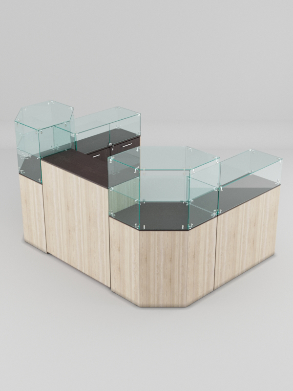 Данная модель представляет собой открытую симметричную систему из нескольких прилавков. Сюда входят прямоугольные прилавки с витриной, шестиугольные прилавки с одной полкой, а также закрытый выкатной прилавок.