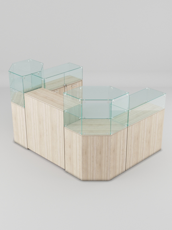 Данная модель представляет собой открытую симметричную систему из нескольких прилавков. Сюда входят прямоугольные прилавки с витриной, шестиугольные прилавки с одной полкой, а также закрытый выкатной прилавок.