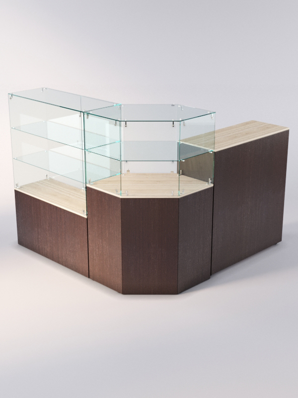 Данная модель представляет собой открытую угловую систему из нескольких прилавков. Сюда входят прямоугольный прилавок с двумя полками, шестиугольный прилавок с полкой, а также закрытый выкатной прилавок.
