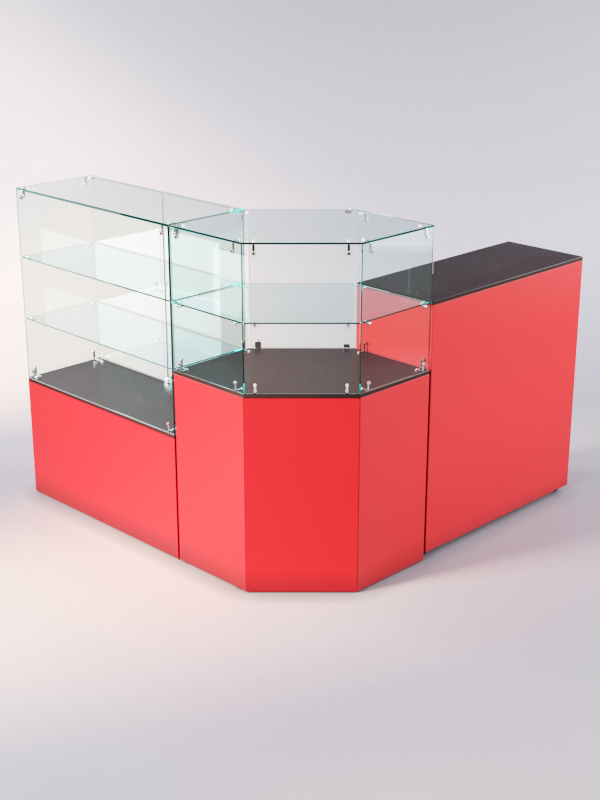 Данная модель представляет собой открытую угловую систему из нескольких прилавков. Сюда входят прямоугольный прилавок с двумя полками, шестиугольный прилавок с полкой, а также закрытый выкатной прилавок.