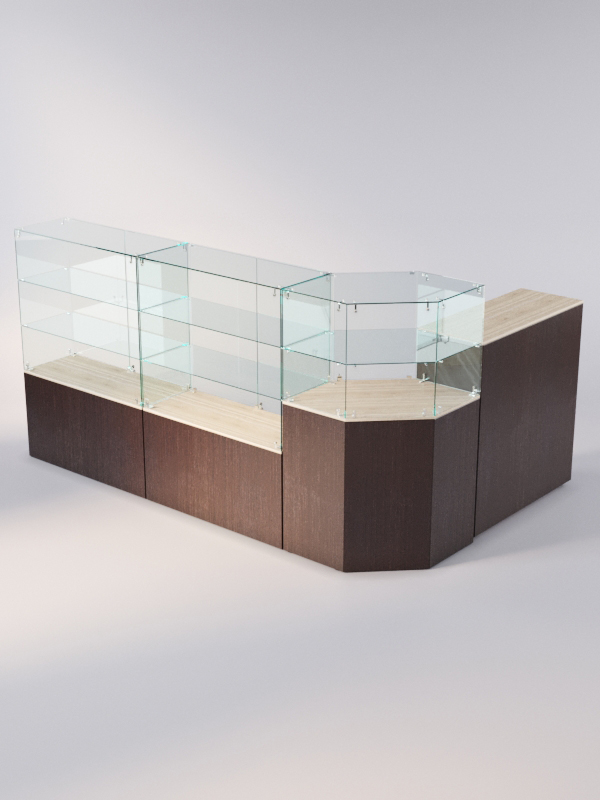 Данная модель представляет собой открытую систему из нескольких прилавков. Сюда входят прямоугольные прилавки с двумя полками, шестиугольный прилавок с полкой, а также закрытый выкатной прилавок.